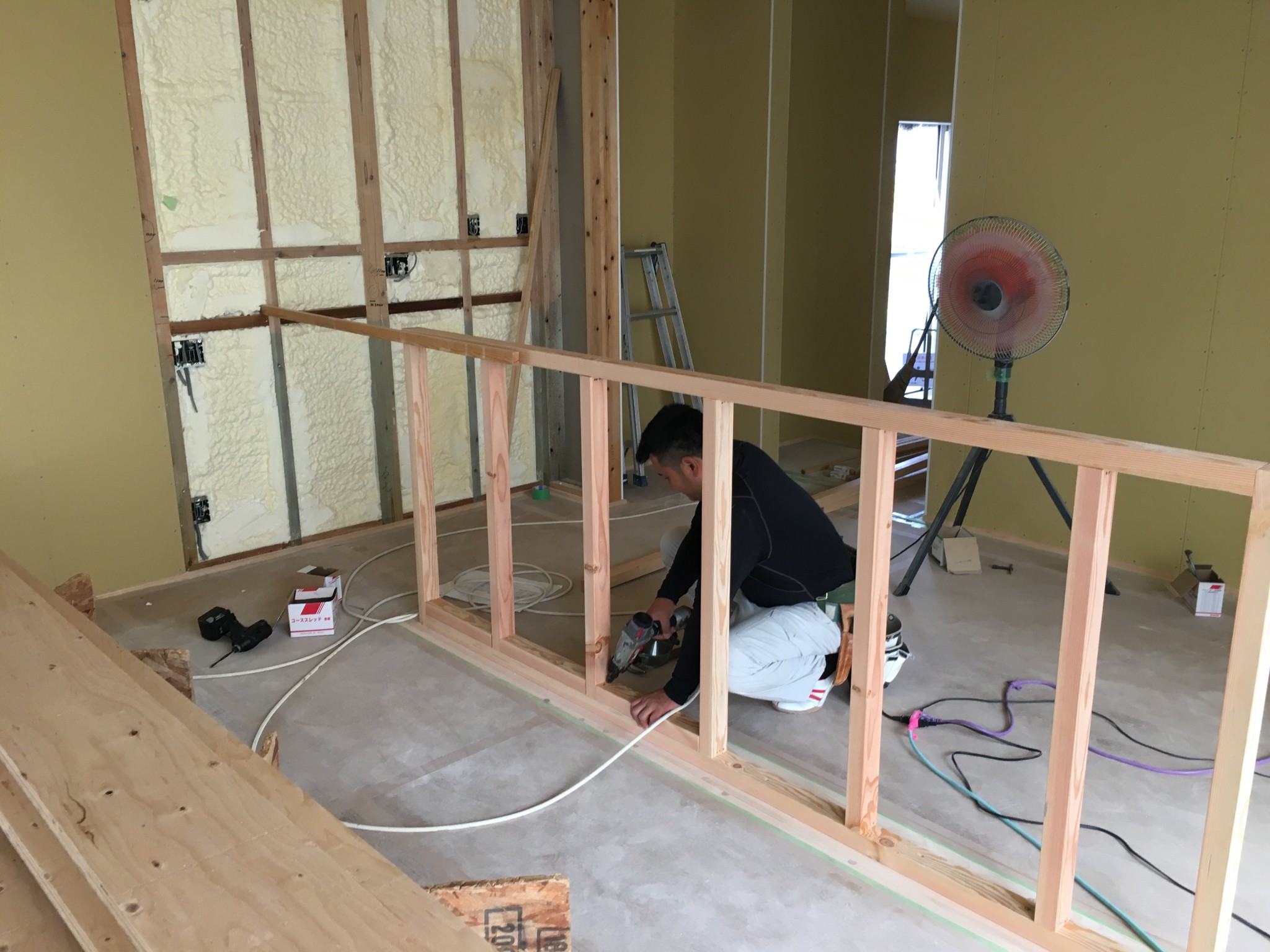 カウンターの向こうには製作のキッチンが取り付く予定になっています。