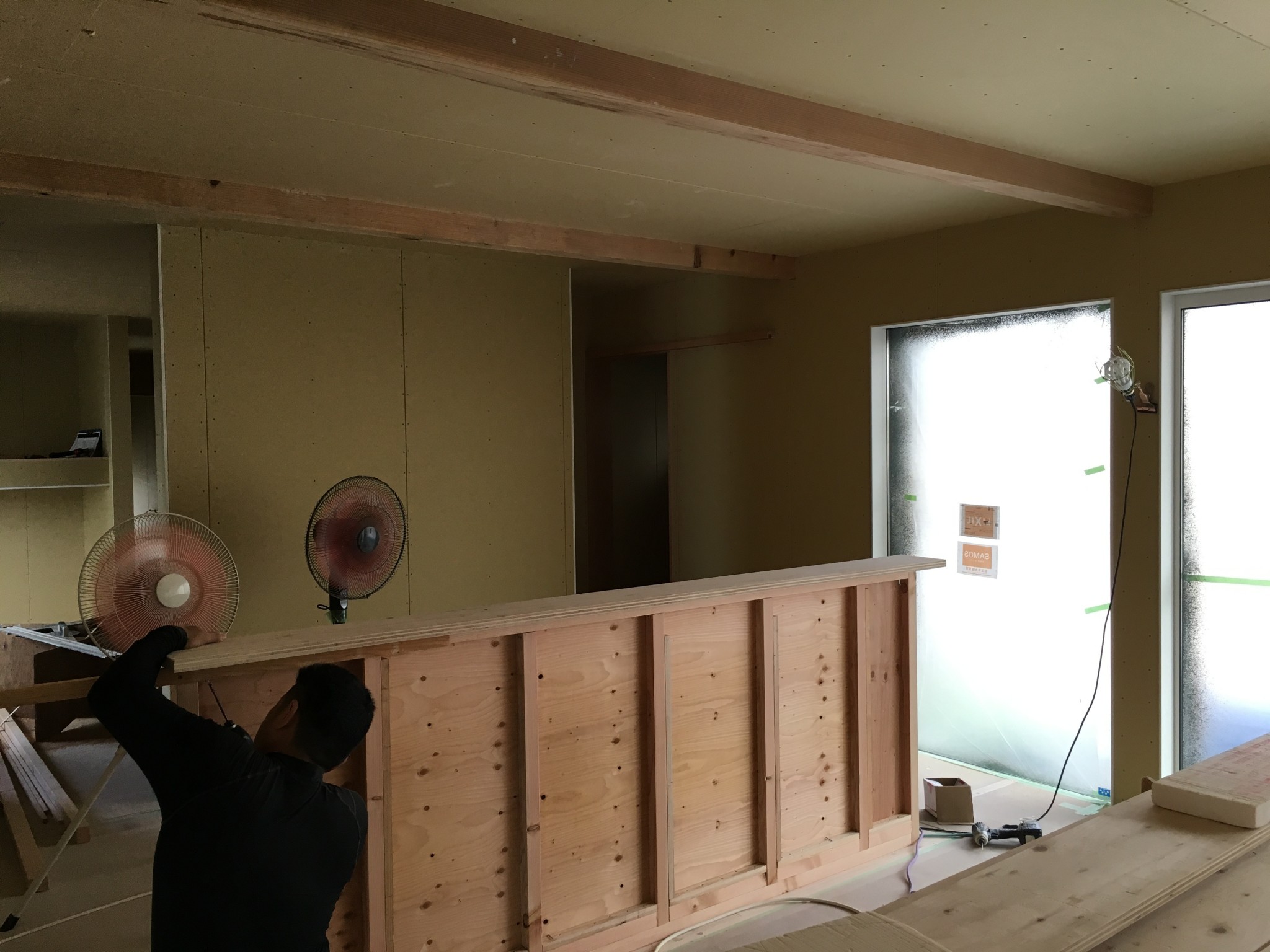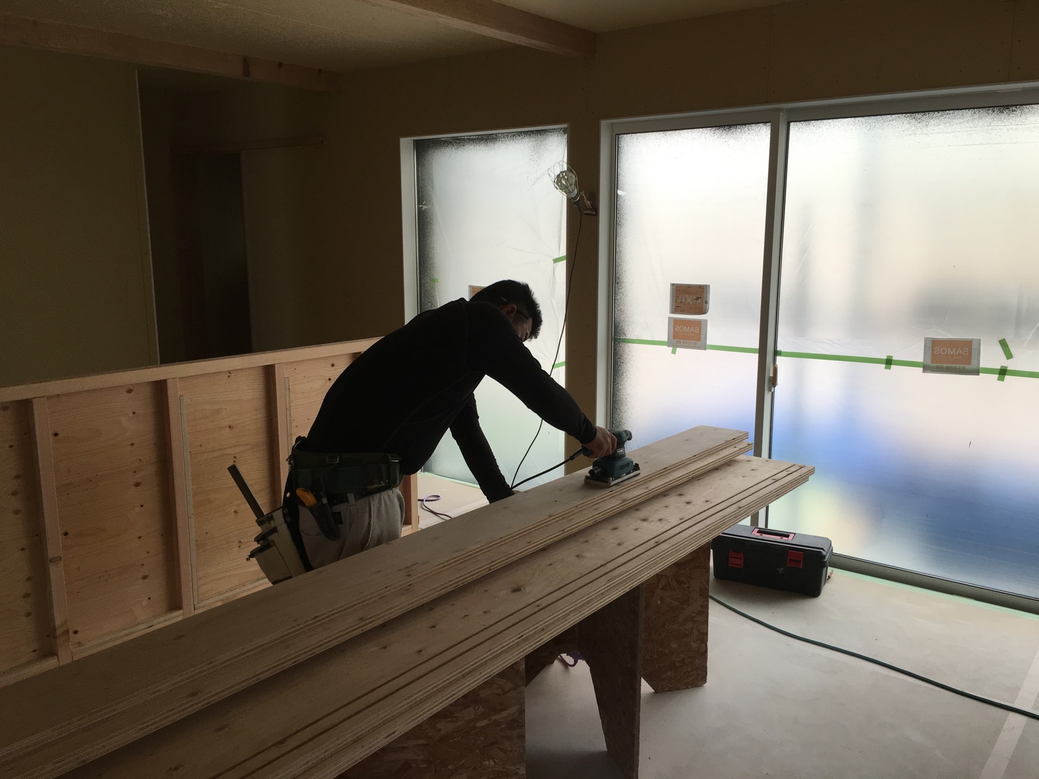 カウンターの天板は大工さんがペーパーヤスリをかけて綺麗に仕上がりました。