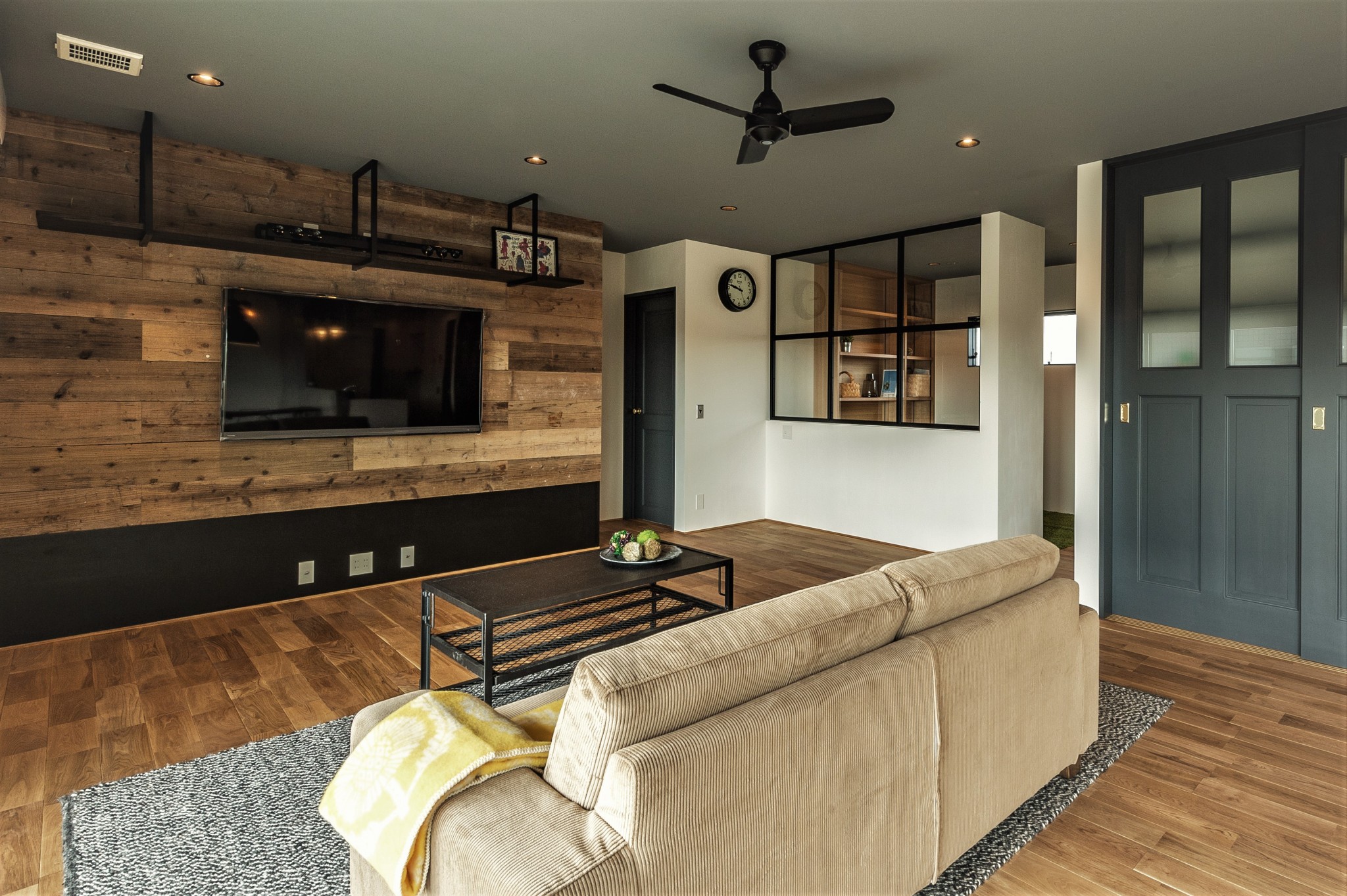リビングの壁一面には古材の足場板を。