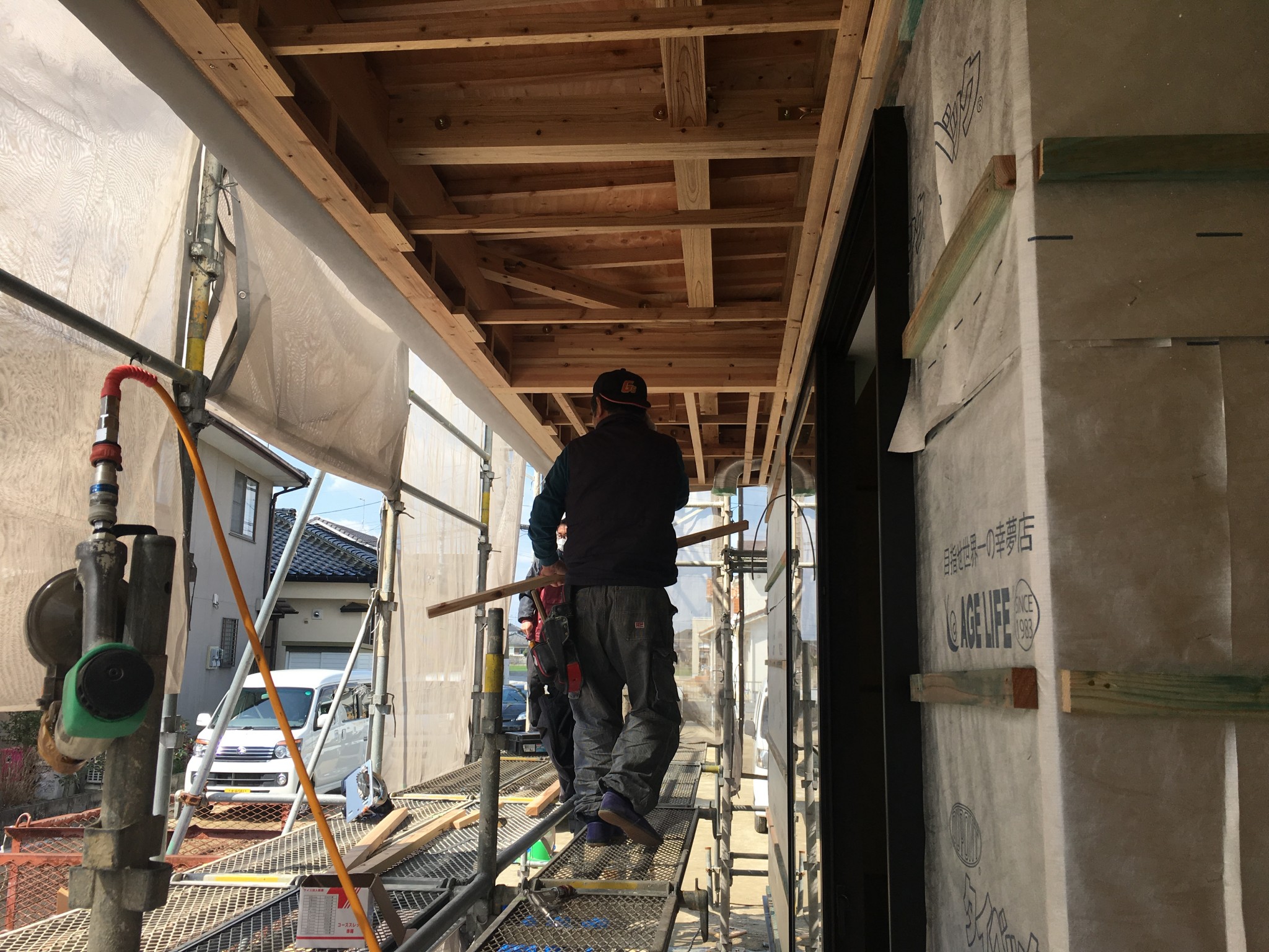 大工さんの床張りが終わり、外部の板張りが進んでいます。