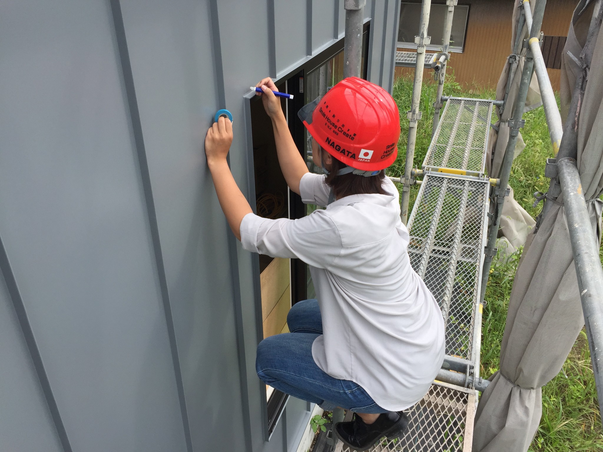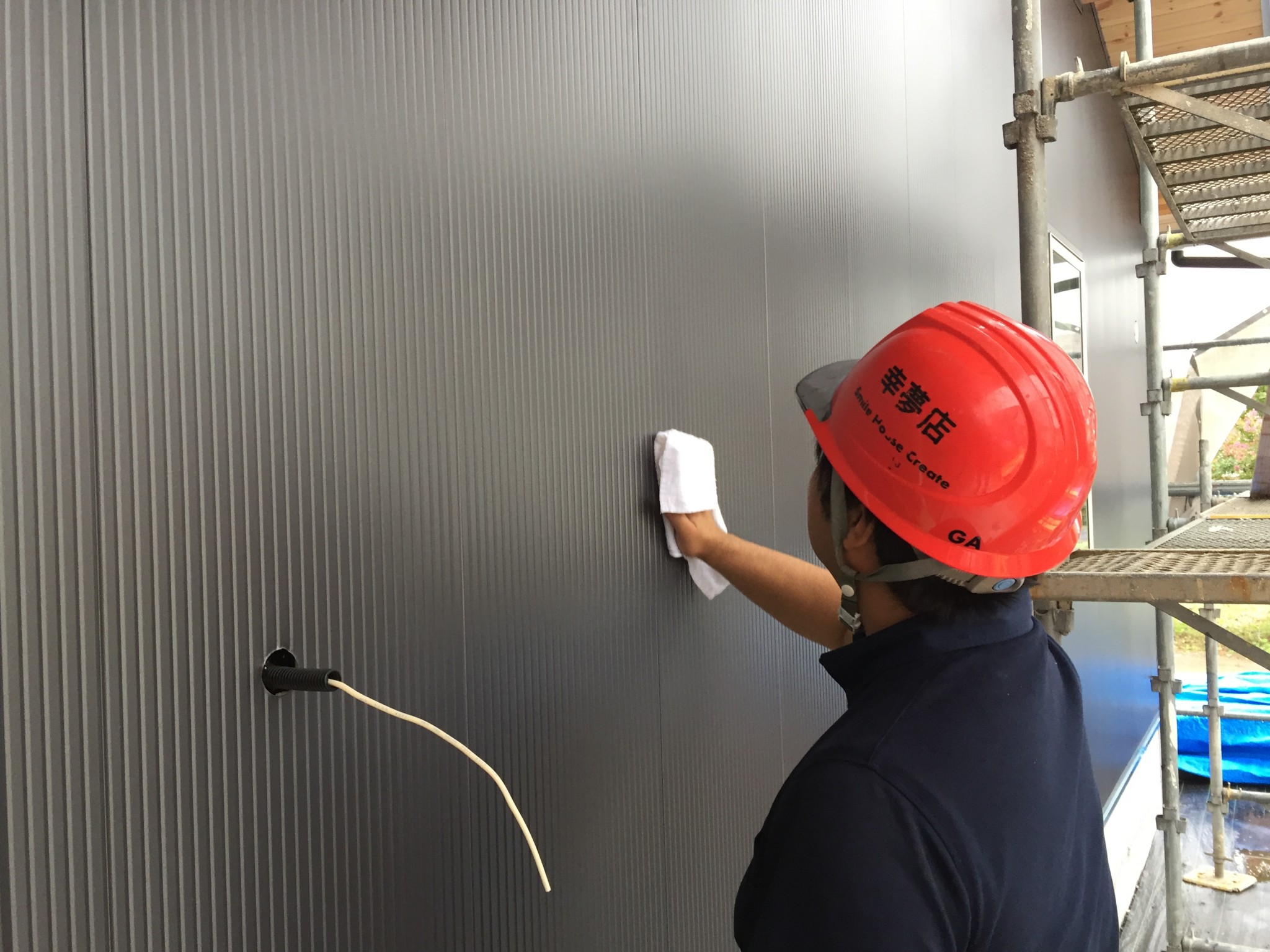 屋根、壁の仕上がりの確認や、汚れがあった場合は拭き掃除などをスタッフみんなで行います。