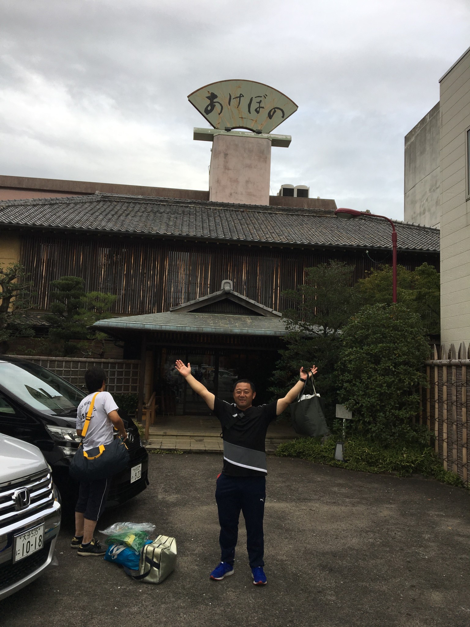旅館をバックにポーズとってくれました(^^)