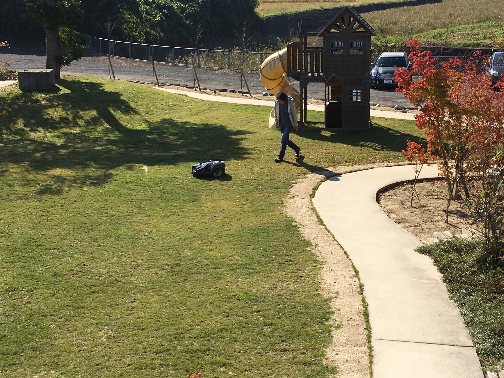 つい先ほども自分で充電をしに家(充電器)へ戻り、休憩(充電)を終え、また仕事(芝刈り)に出ていきました。