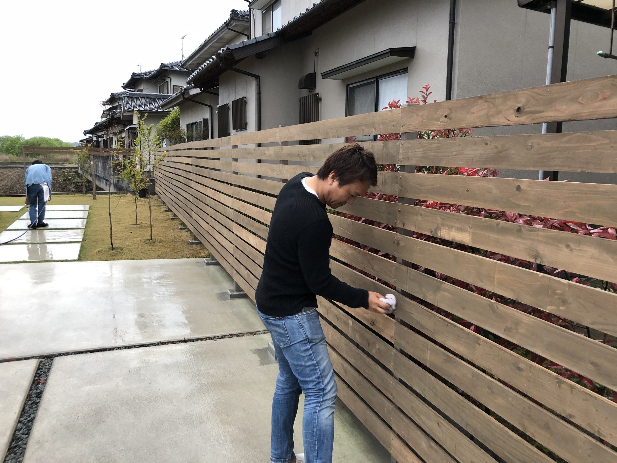 木屑がついたフェンスを磨いたり