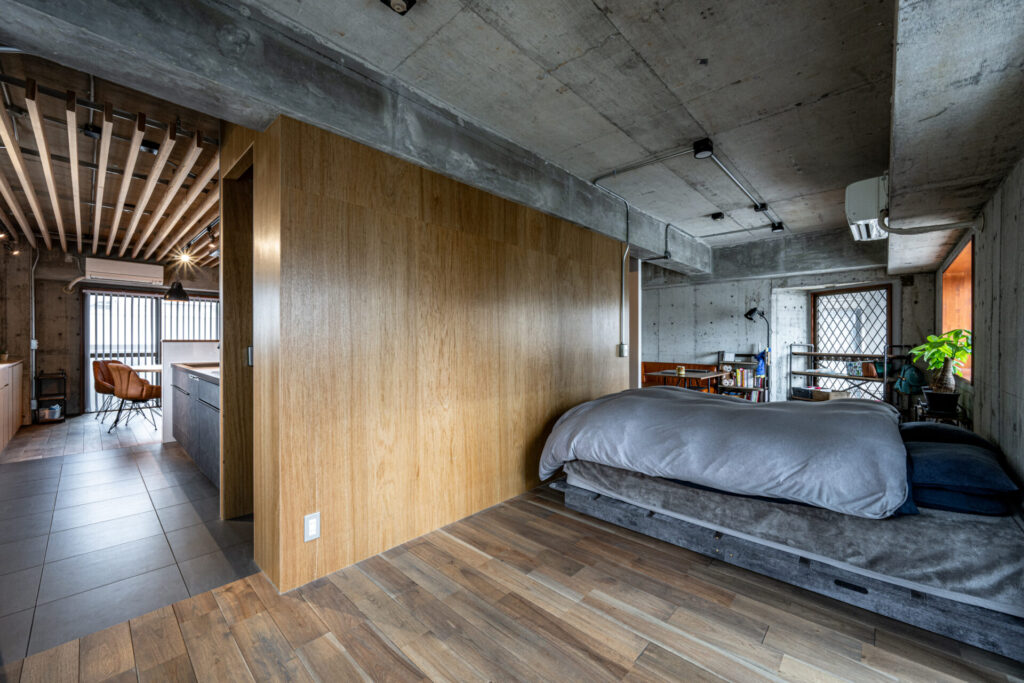 木格子や無垢フローリング、ラワンベニヤの壁、