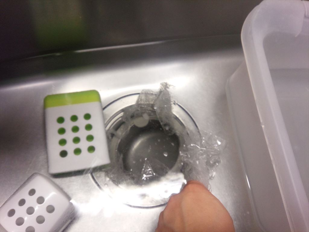 まず、排水溝に2、3重にしたラップをしきます。