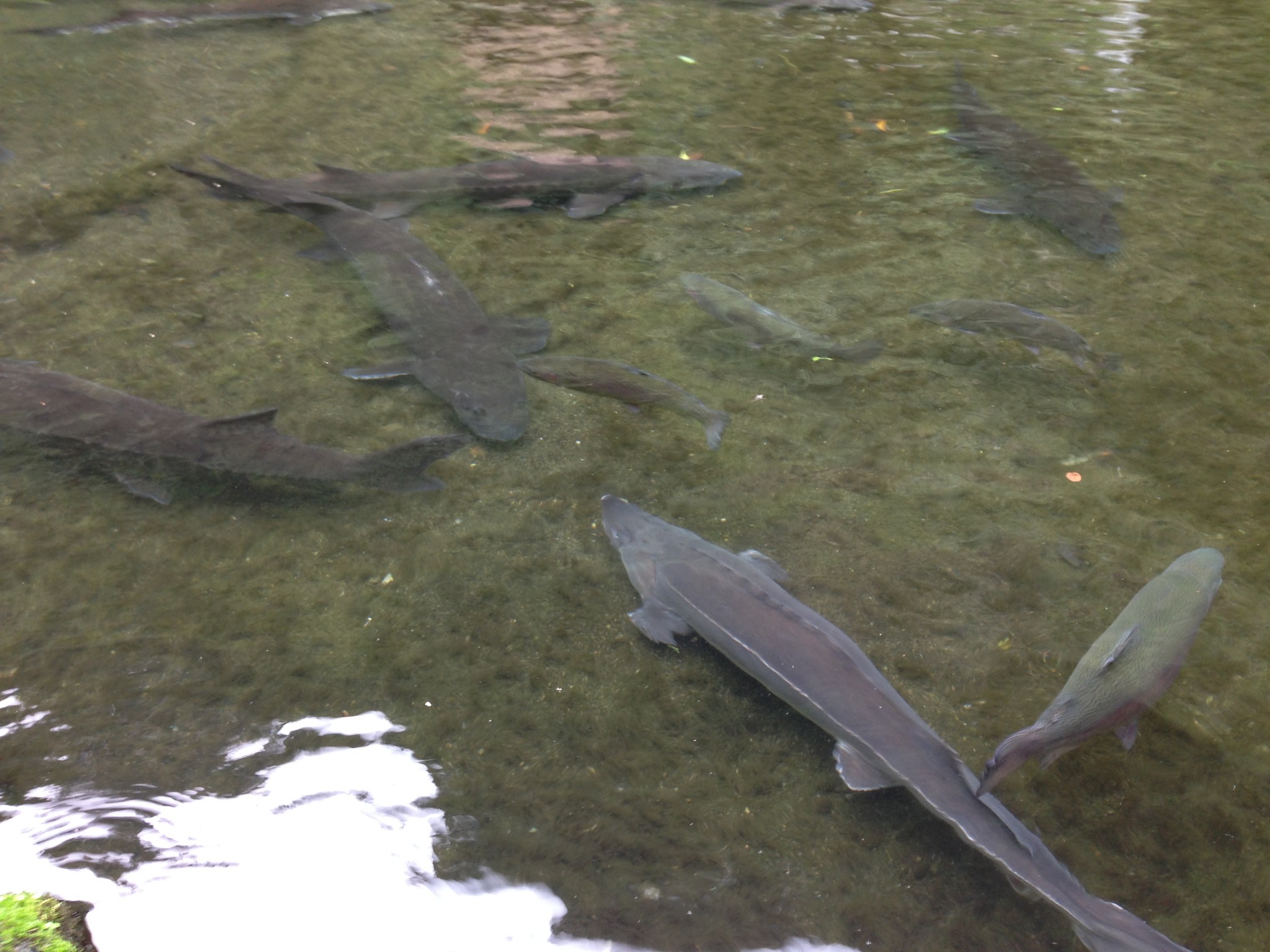 チョウザメなどちっちゃいサメが目の前で泳いでいます。