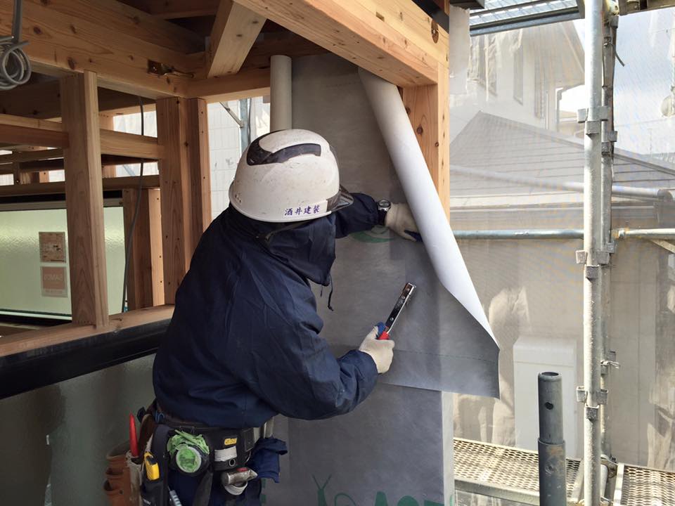 本日、外壁工事の防水シート張りに入っています。