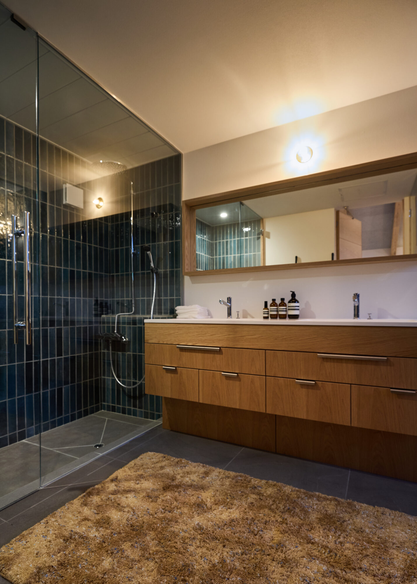 また、オーク材をふんだんに使用した内装とタイルの組み合わせが、上質で落ち着いた雰囲気を演出しています。