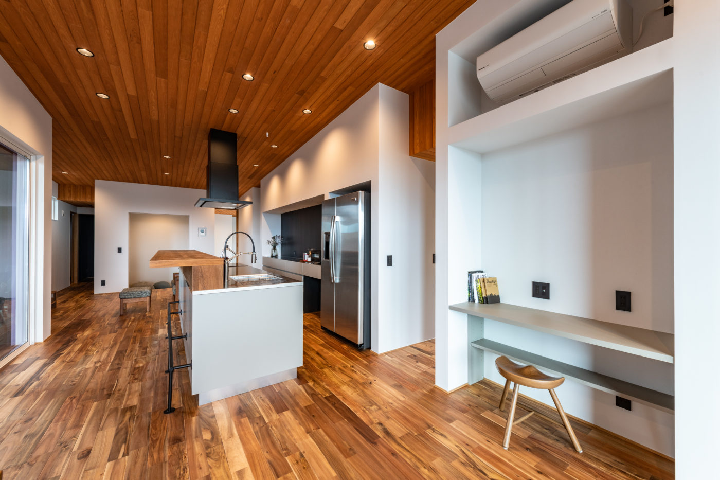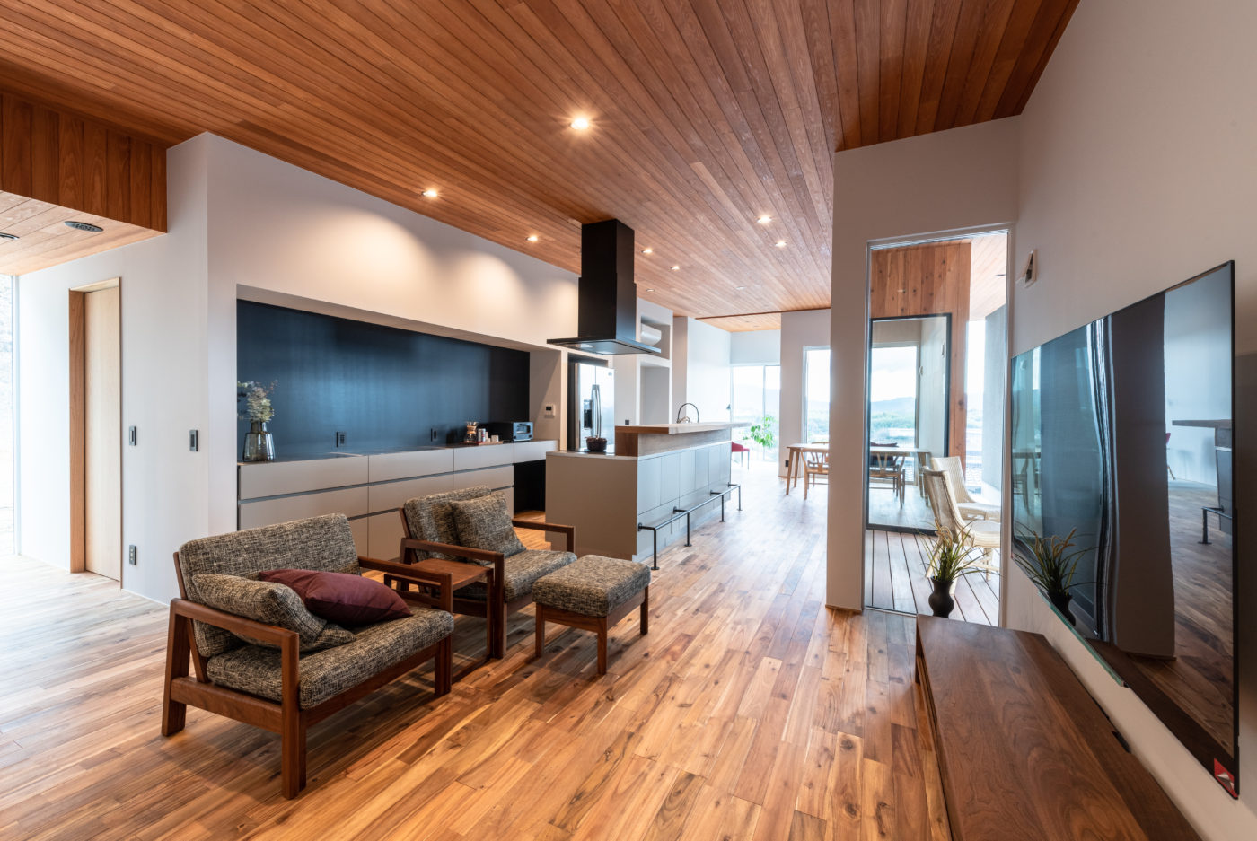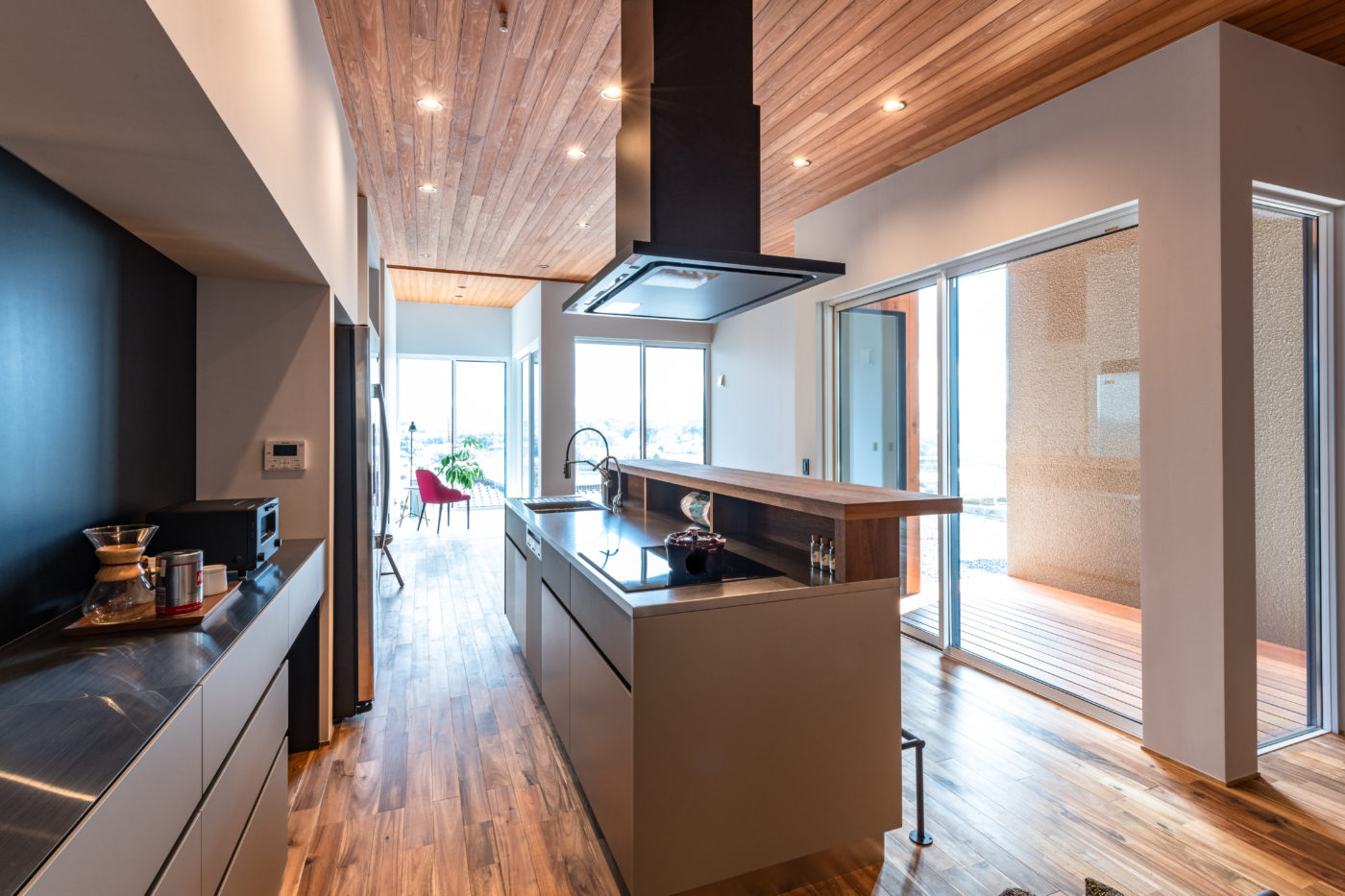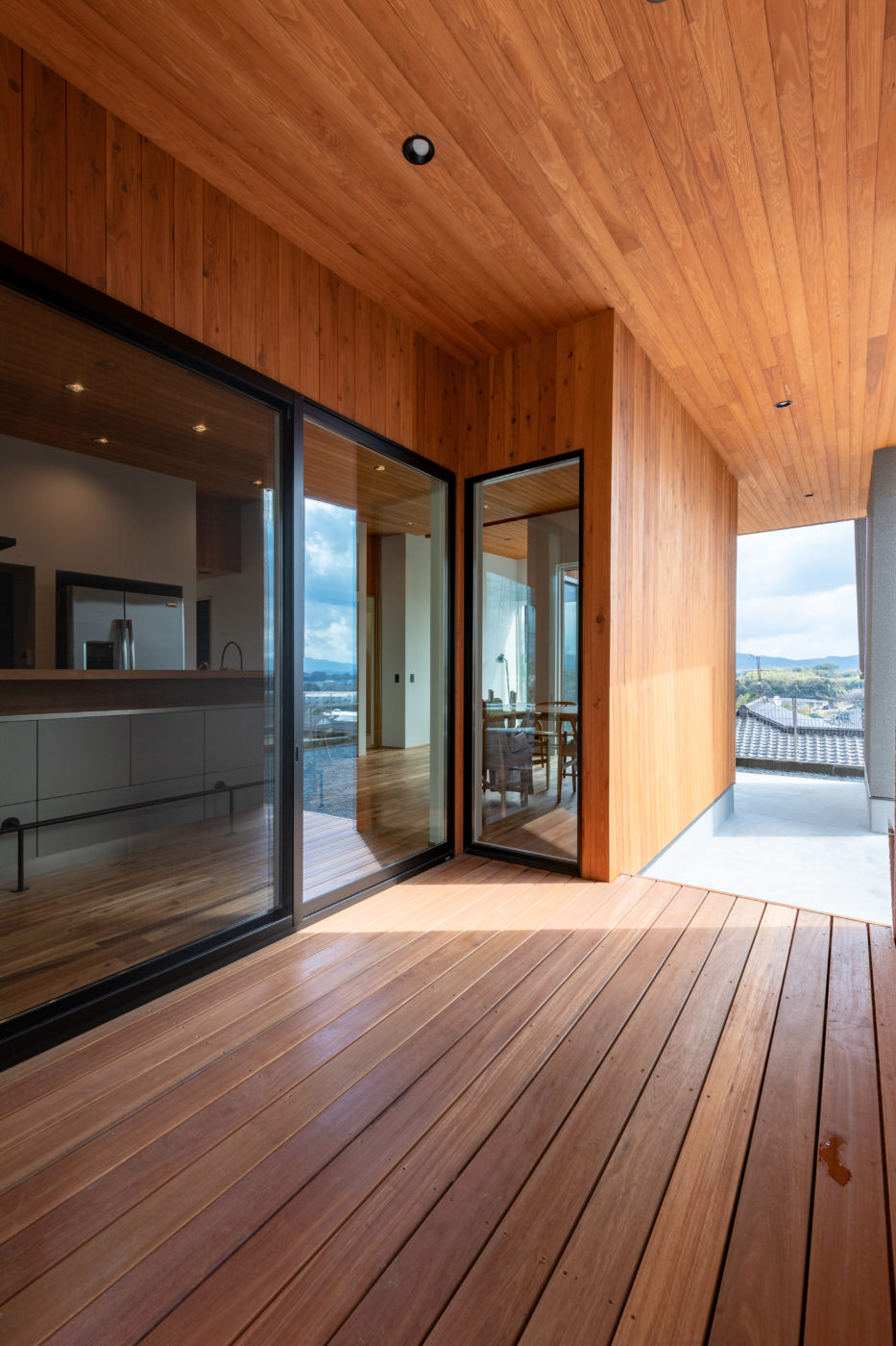 眺望にこだわり、オーナーが見つけた高台の敷地。休みの日は、風景を眺めながら、コーヒーを飲んだり、外でご飯を食べたり。周りを気にせず生活できる住処。