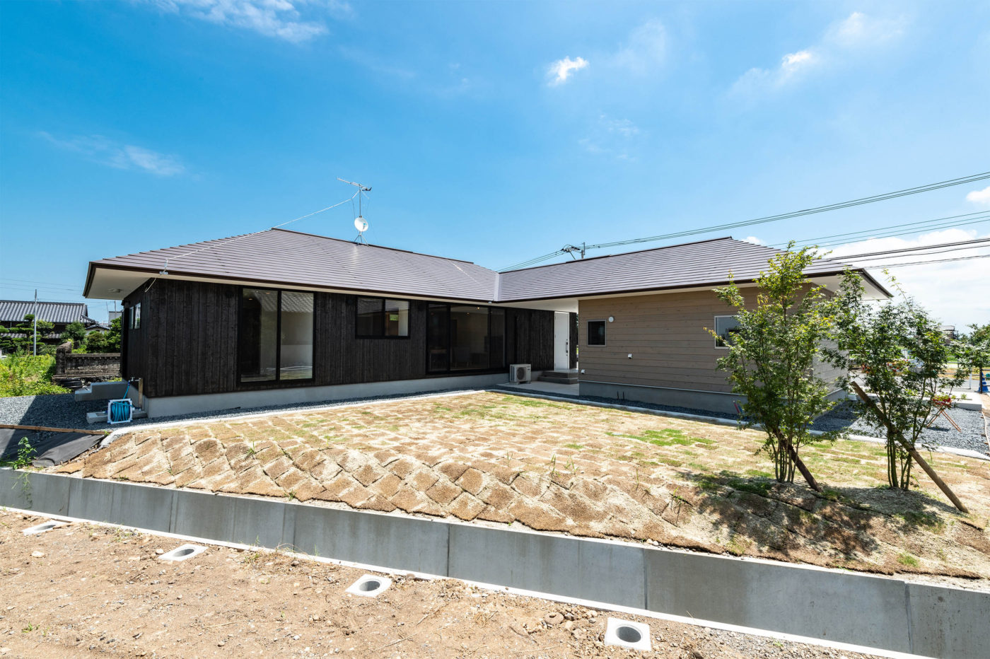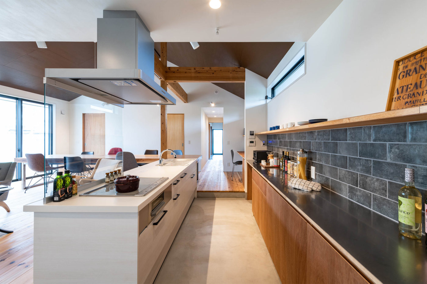 「美容院を始めたい」の一言から始まったプロジェクト。一般的には店舗と住宅をくっつけるのですが、あえて離すことによって、仕事とプライベートを大切にすることができます。屋根は一つで、真ん中に空間、抜け間を作り、家のむこうに景色が広がる住宅を考えました。家と景色、仕事とプライベートを結びつけた「結びの家」と名付けました。