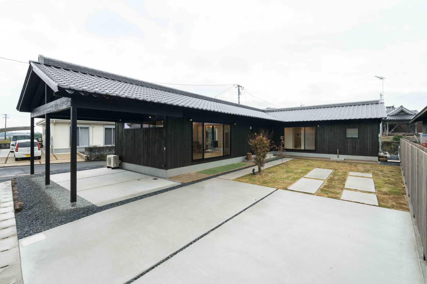 焼杉・瓦屋根という、古き良き日本の住宅で使われてきた素材を使い、敷地に沿うように大屋根をかけ、軒下をつくりました