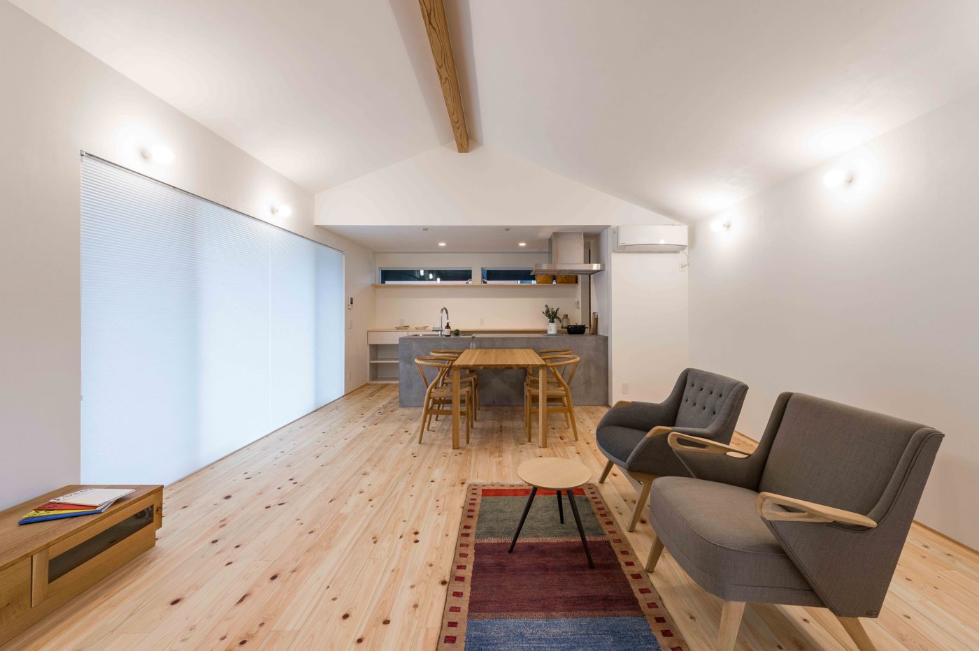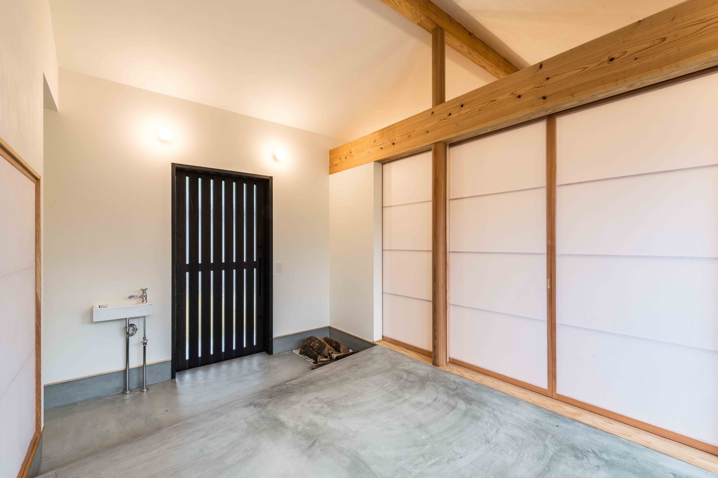 玄関から続く土間スペースの薪ストーブでは、冬に火を入れ家族が集い、四季を愉しむ住宅となっています