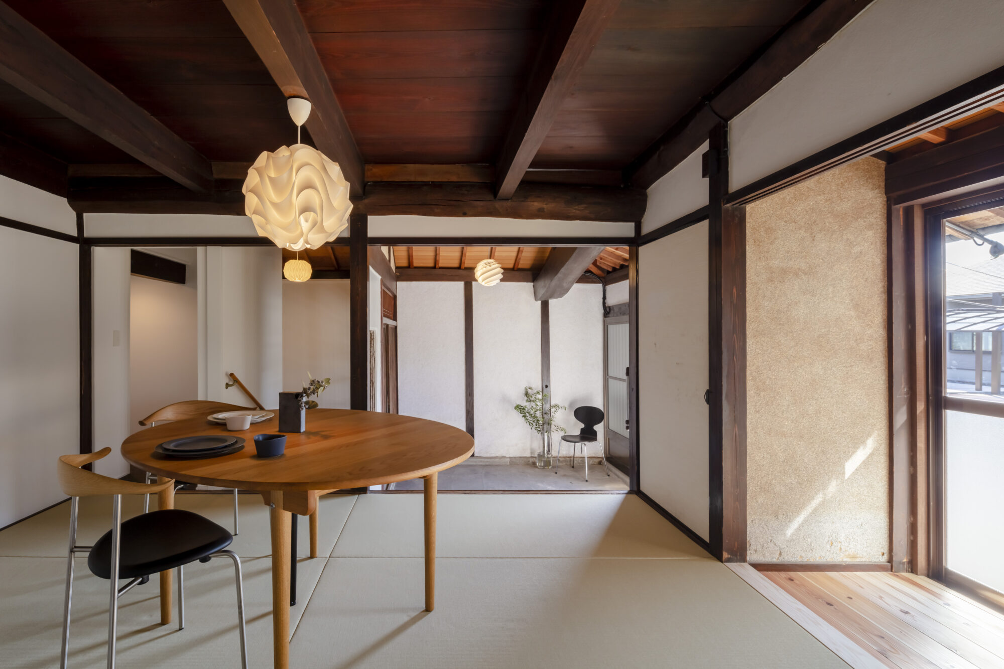 昔特有の土壁は解体しそのままデザインとした仕上げ材に!土の荒々しさと照明をあてた陰影が綺麗です。天井もとっぱらい、そのまま古材をデザインに!!古きよきものを手をいれなければならない部分は修繕し生かせる部分はそのまま使う。古民家と北欧家具の相性も抜群。エッジライフはものの価値を引き出す提案を行なっております。