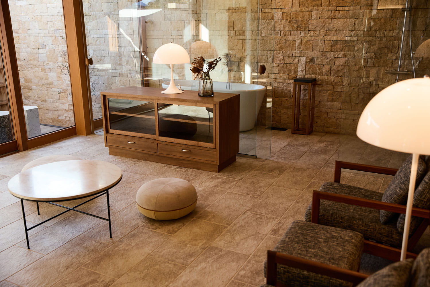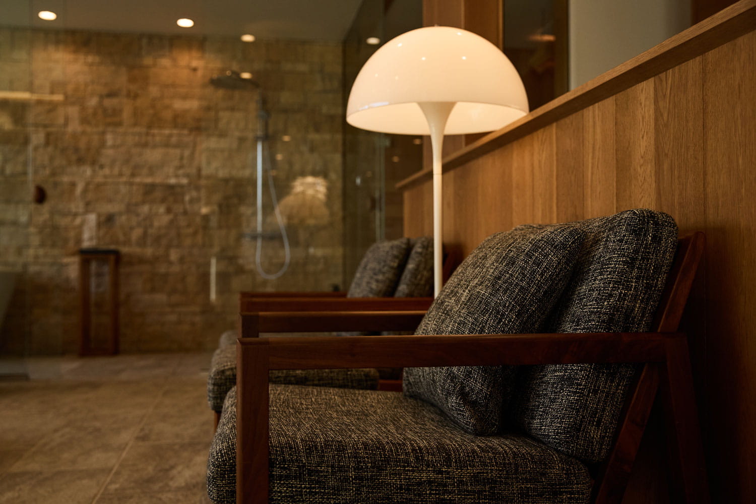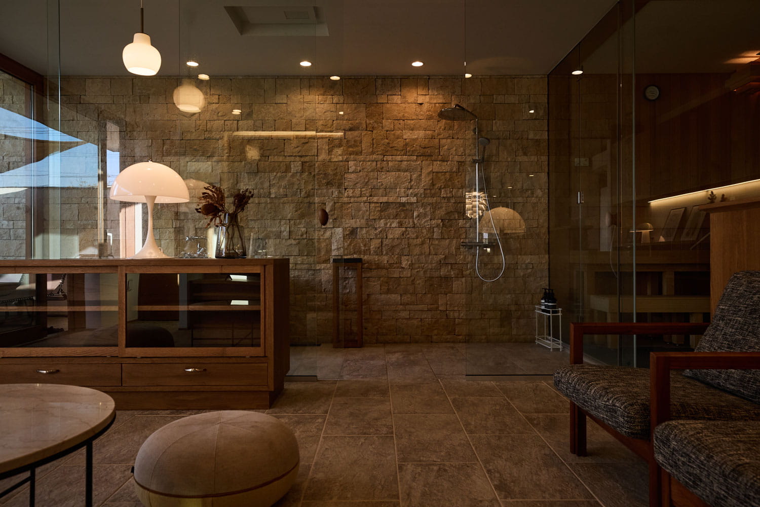 ガラス張りの浴室と直結した本格的なロウリュサウナ、まるでリビングのようにくつろげる広々とした洗面室、そしてデッキにつながるジャグジースペースで、日常の疲れを解きほぐしていただけます。