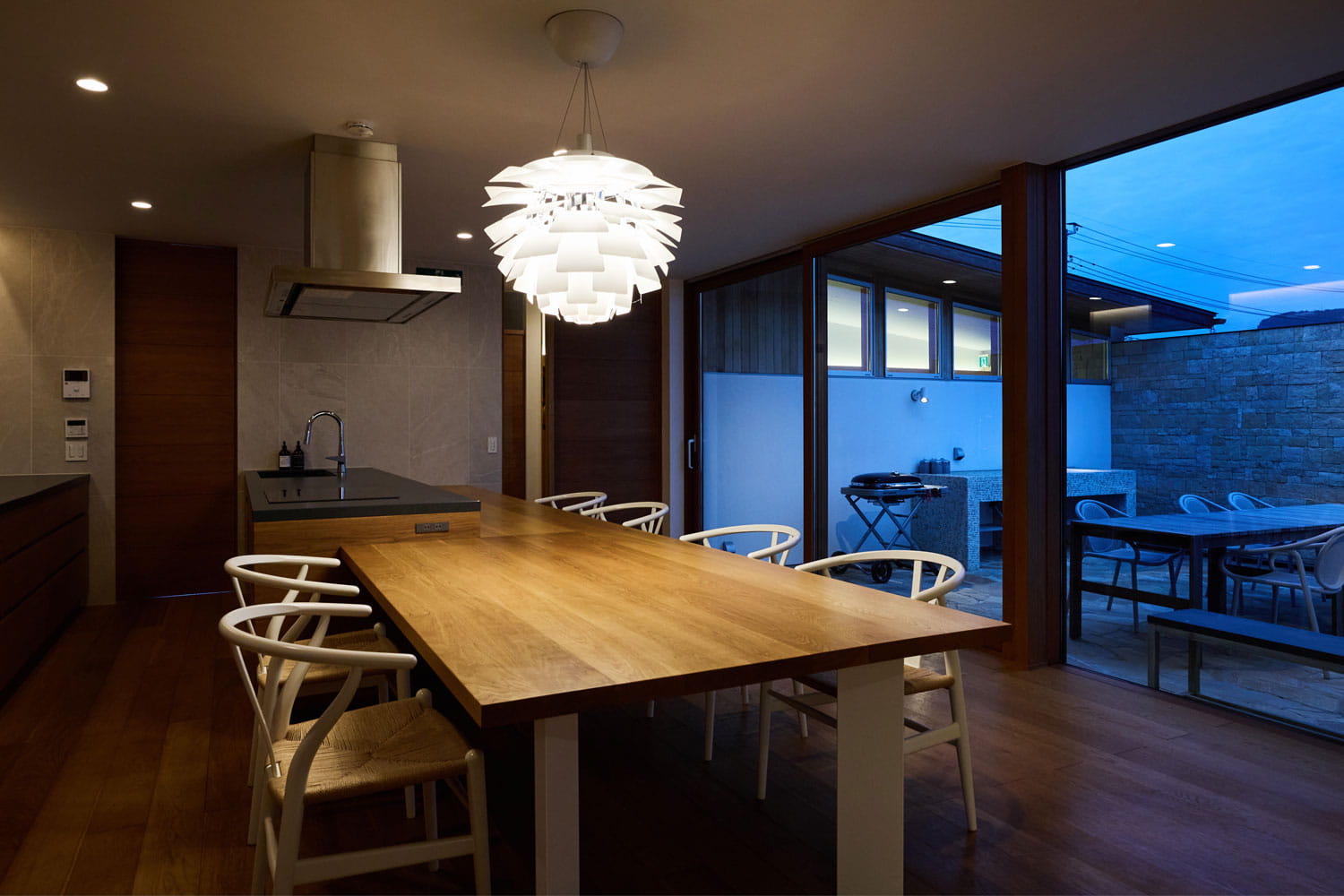 リビングの延長のような設えでバーベキューを楽しめる屋外空間もご用意。